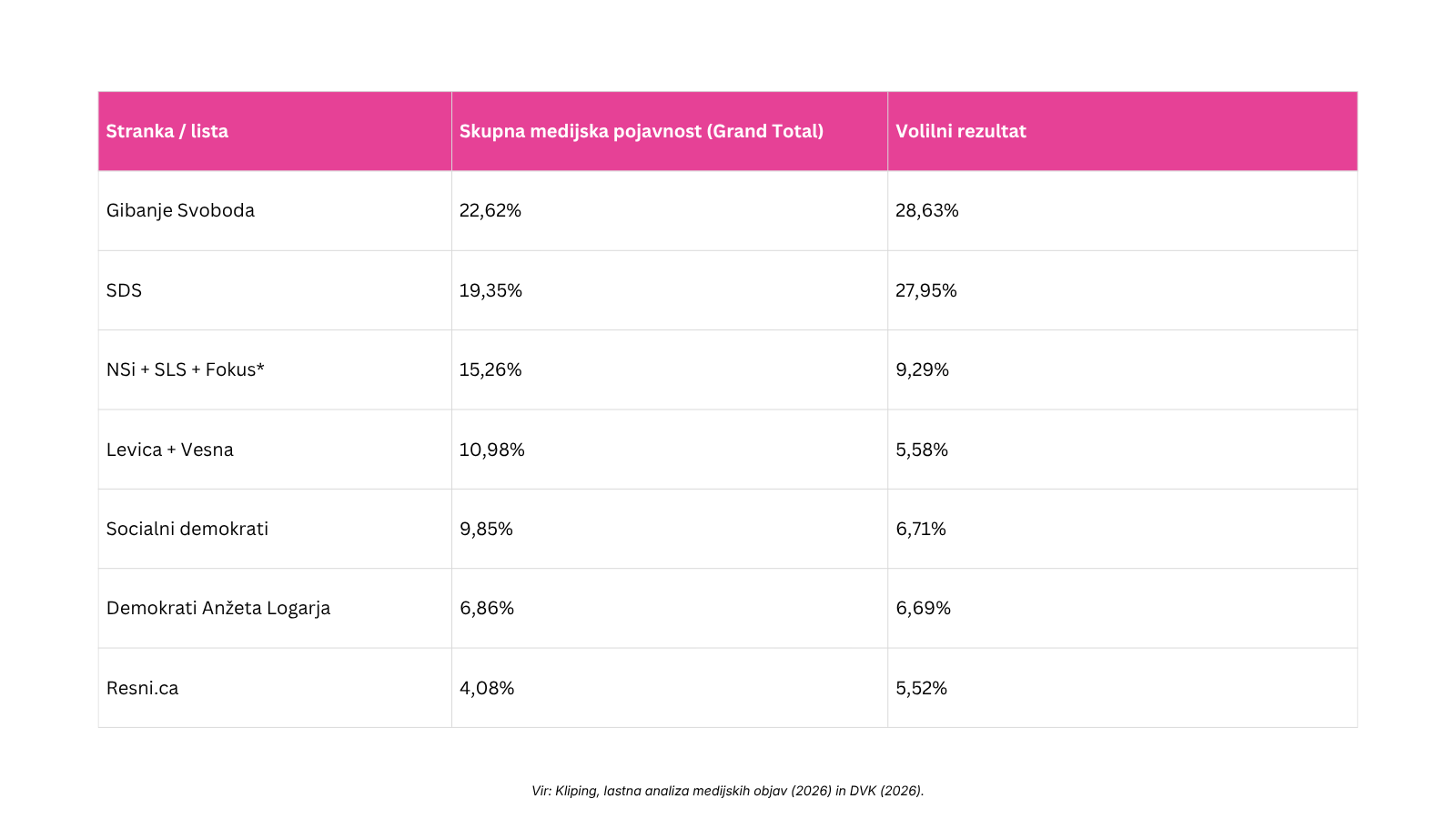 Največje odstopanje vidimo pri Levici + Vesni, ki je v celotnem obdobju dosegla 10,98 % skupne medijske pojavnosti, na volitvah pa 5,58 %. Gre za najbolj izrazit primer nesorazmerja med vidnostjo v medijih in dejansko podporo na volitvah.