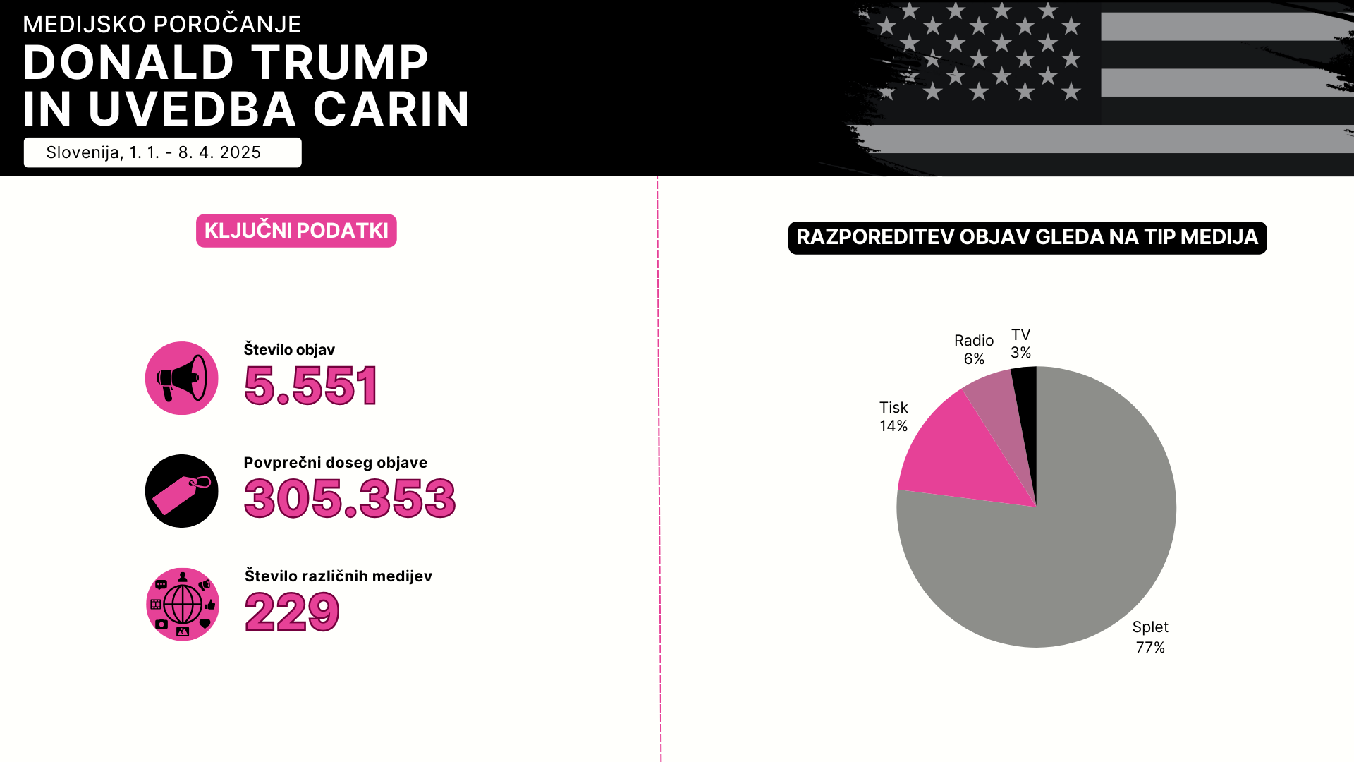 Med 1. januarjem in 8. aprilom 2025 so slovenski mediji zabeležili 5.551 objav o Trumpovih carinah, katerih povprečni doseg je bil 305.353 ljudi na objavo. Največ objav je bilo na spletu (77 %), sledili so tisk, radio in televizija. Objave na spletu so imele največji doseg (377.343), medtem ko so objave na radiu dosegle najmanjši doseg (45.215).