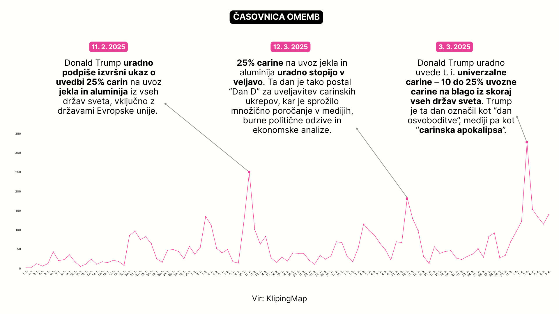 Medijsko poročanje o Trumpovih carinskih ukrepih je doseglo vrhunec ob naslednjih ključnih dogodkih: